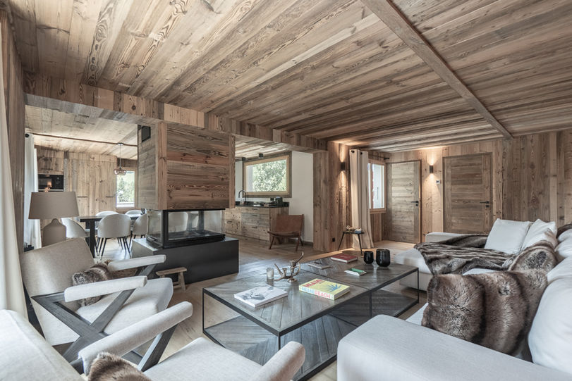Espace jour : grand salon avec cheminée centrale, triple exposition, WC visiteurs.