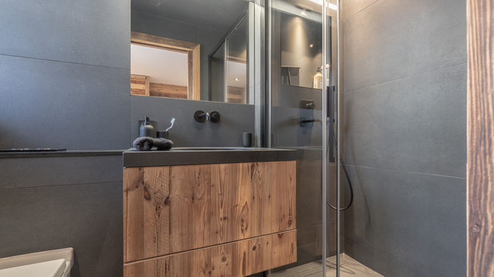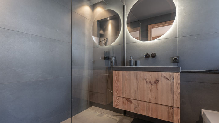 Rez-de-chaussée : une grande entrée avec vestiaire, un WC visiteur, 3 chambres et leur 3 salles de bain en suite, un garage pour deux véhicules avec skiroom, une buanderie avec partie technique et un second garage de type remise.